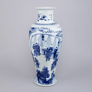 £7,500Japanese porcelain celadon lavender crackle glazed vase with ovoid body, ribbed sloping shoulder, flared tall foot and everted lipped rim, covered overall on the base and interior with an even crackled glaze thinning at the edges, all on a short brown biscuit foot rim.