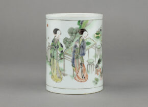 Marchant非常重视器物的传承历史,此次展览中有两件为赵从衍先生旧藏,编号12和编号18。其中一件是精美的仕女图笔筒。笔筒可以说是最受学者和藏家欢迎的器型之一,我们在此次展览中共收录了四只。编号12的花鸟图棒槌瓶画风精巧,彩绘犹如画卷贯穿瓶身一周。在赵从衍先生以前,此瓶为Lansdowne P. C.侯爵旧藏,并于1973年在伦敦苏富比售出。